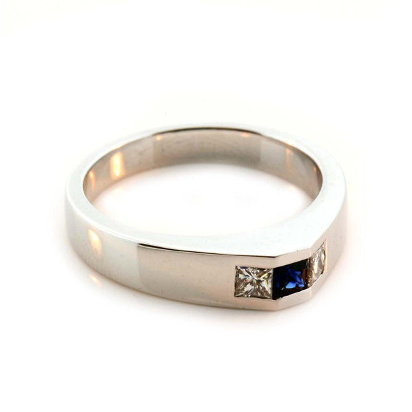 Gent's 14k white gold sapphire and diamond ring. The ring is set with a 3mm square Ceylonese sapphire and 0.33cts of princess cut diamonds, colour FG, clarity VS-SI1.