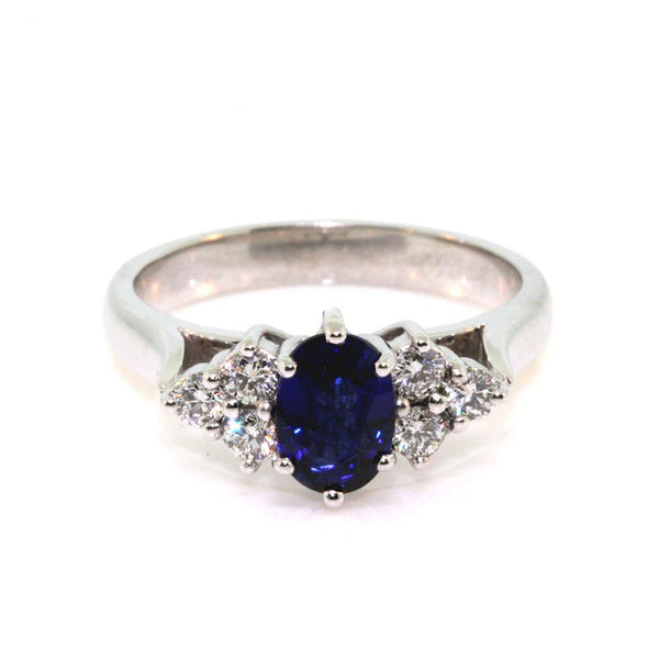 Platinum Sapphire and Diamond Dress Ring. The ring is set with a 1ct 7 x 5mm oval intense blue Ceylonese sapphire and 0.30cts of round brilliant cut diamonds, quality FG / VS-SI1.