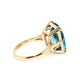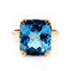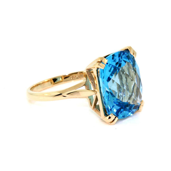 9k yellow gold dress ring set with a 14x12mm cushion shape 10.6ct chequerboard cut Swiss blue topaz.