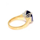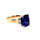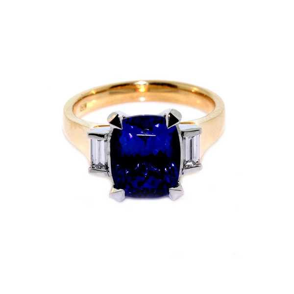 Custom-Made 18k Yellow Gold and Platinum Tanzanite and Diamond Ring. This ring is set with a 5.50ct cushion shaped Tanzanite measuring 11.2x9.1mm, intense violetish bue in colour, and 0.26cts of baguette cut diamonds, E-F colour and VS clarity.