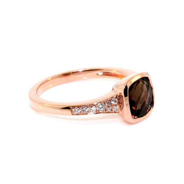 9k rose gold dress ring set with a 1.5ct cushion cut smokey quartz and 0.16cts of round brilliant cut diamonds, quality GH / SI.