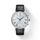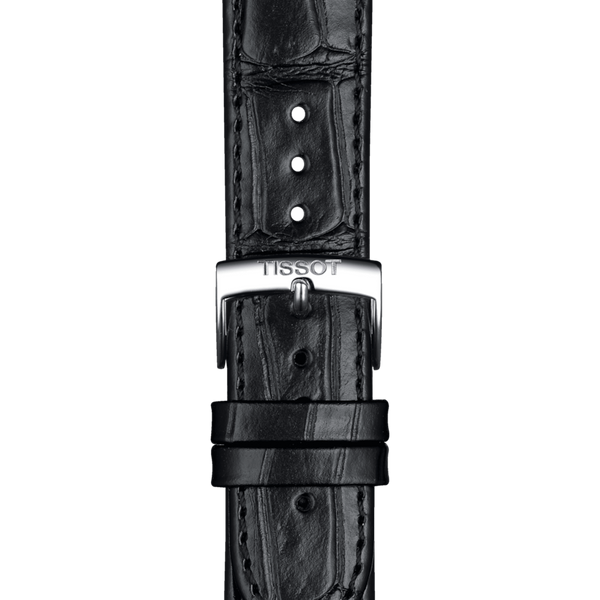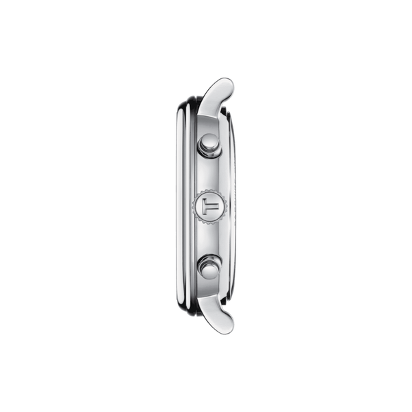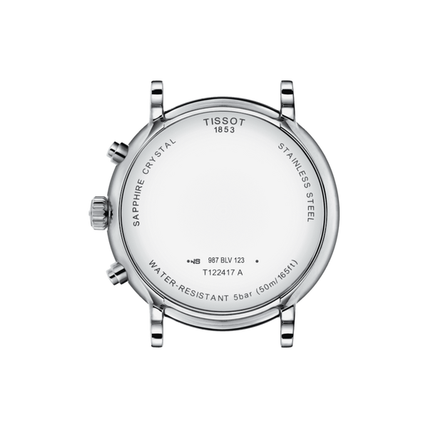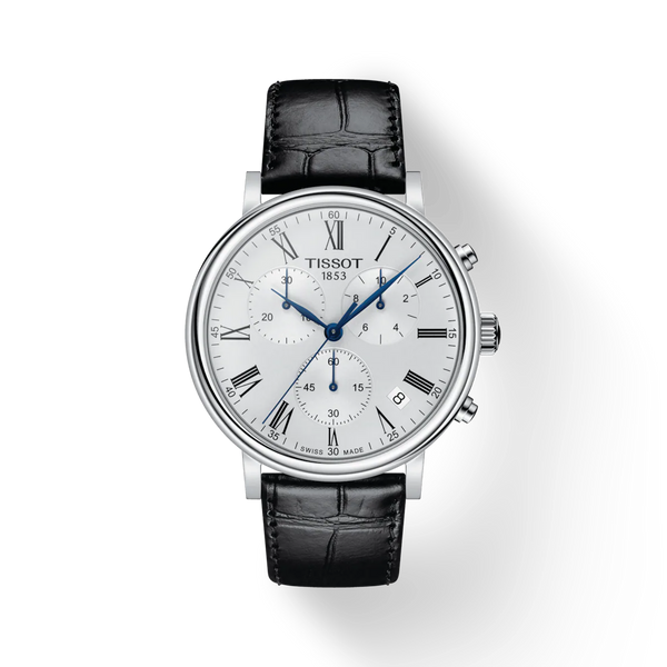 Gents Tissot Carson Chronograph 41mm Stainless Steel Case Black Leather Strap Sapphire Crystal White Dial Black Roman Numerals Blue Hands Date Quartz Watch. Currently out of stock but a new piece is expected to arrive instore soon.