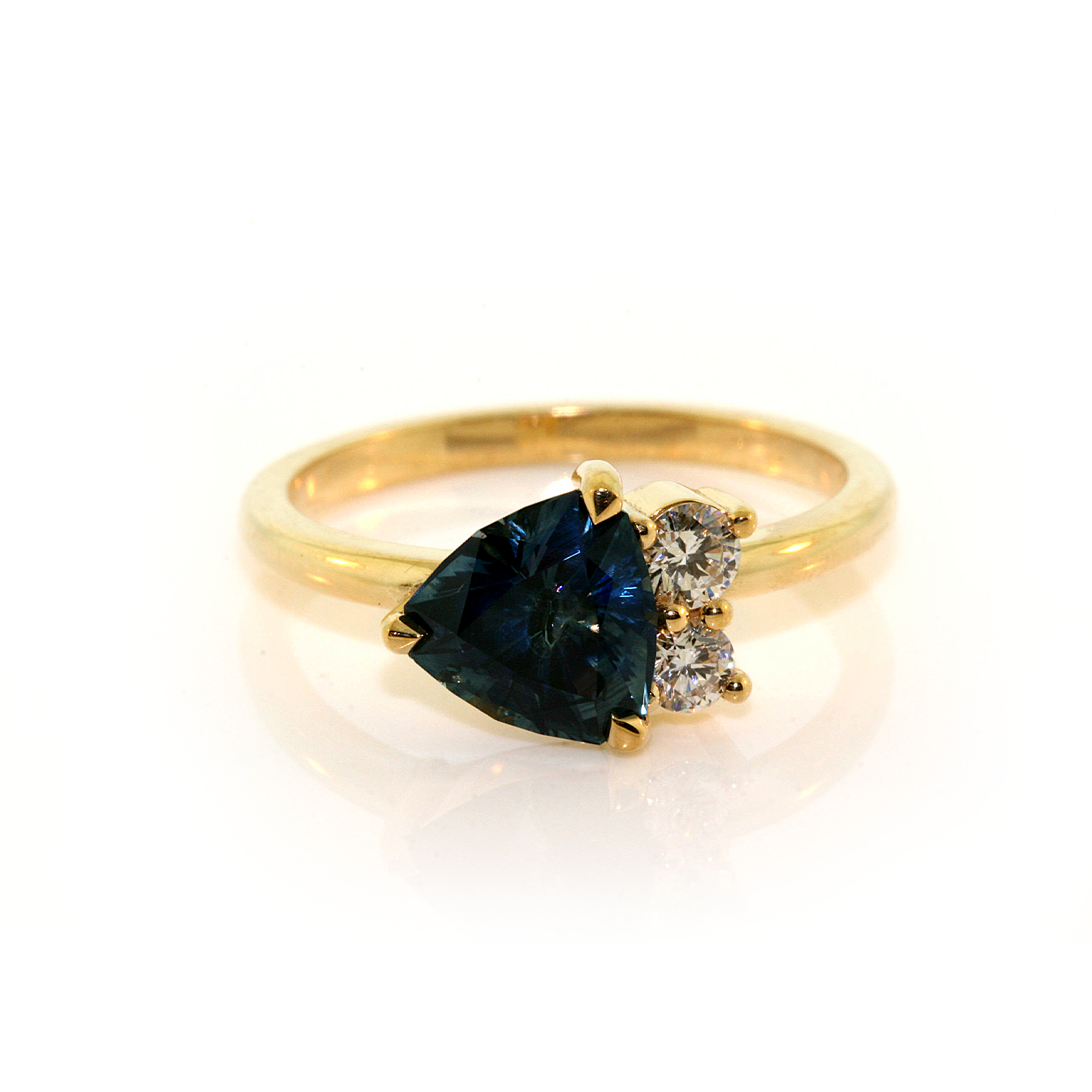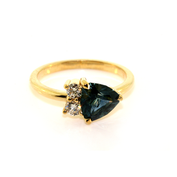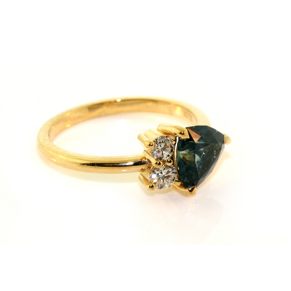 From our Workshop, a custom-made 18k yellow gold sapphire and diamond ring. This ring is set with a 1.76ct fancy trillion shaped sapphire, greenish-blue in colour, from Montana. The ring is set with 0.22cts of round brilliant cut diamonds, D-F colour, VS-SI1 clarity.