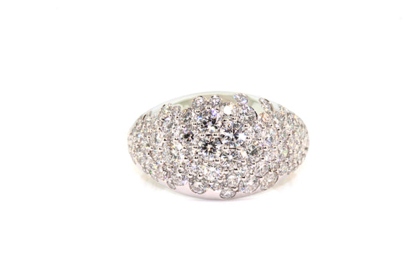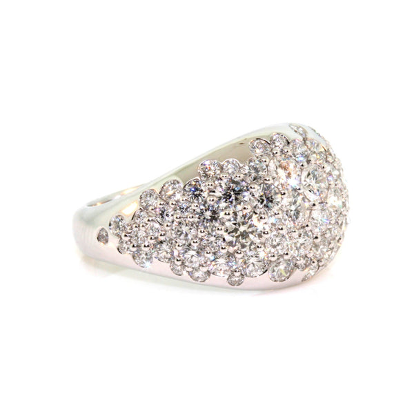 18k White Gold Diamond Set Dome Style Ring. This ring is set with 2.56cts of round brilliant cut diamonds, FG colour, SI1=-2 clarity. The diamonds are pave set into the domed top of the ring. The ring is 13mm wide at the top, tapering to the base. This design is made to order in the required finger size.