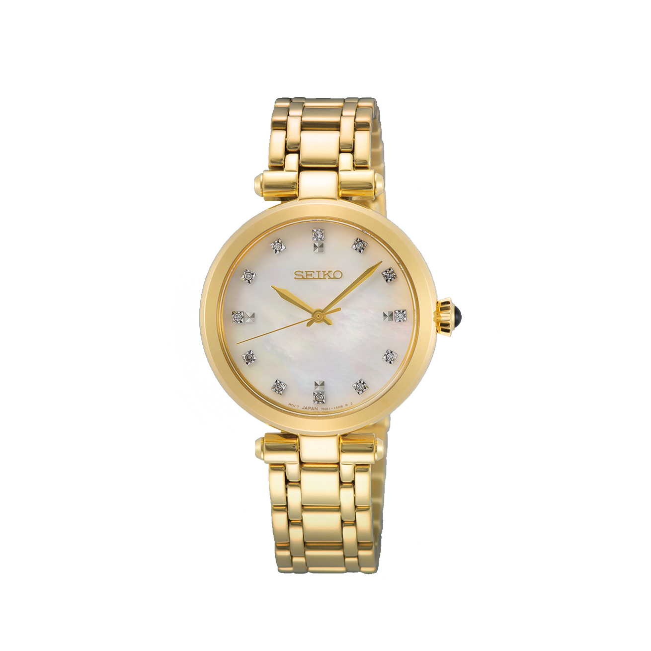 Ladies' Seiko Dress Watch. The 30mm case and bracelet are yellow gold PVD on stainless steel. The dial is mother-of-pearl with twelve diamond set hour markers and the glass is sapphire crystal. The movement is quartz. Currently out of stock but a new piece is expected to arrive instore soon.