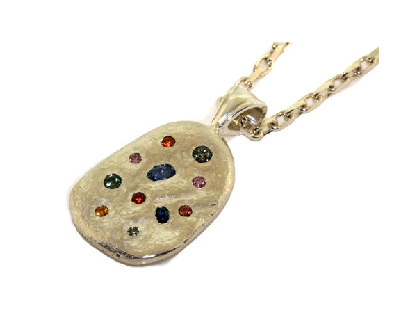 From our workshop, 2.16cts of oval and round sapphires set into a free form sterling silver pendant. The pendant measures 36mm tall (excluding the bail) x 27mm wide and weighs 37.5 grams. The pendant comes with a sterling silver diamond cut heavy cable link chain, weighing 15.2 grams.
