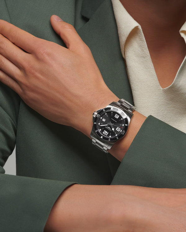 Gent's Longines Hydro Conquest Quartz Watch. The 41mm case and bracelet are stainless steel, the dial and bezel are black and the glass is sapphire crystal. The watch features a date function. The watch is 300 metres water resistant and the movement is quartz.