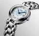 Longines Prima Luna Automatic Watch. The 26.5mm case and bracelet are stainless steel, the dial is white mother of pearl with diamond set hour markers and blue hands. The glass is sapphire crystal. The movement is automatic. Currently out of stock.