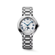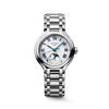 Ladies' Longines PrimaLuna Moonphase Automatic Watch. The 34mm case and bracelet are stainless steel. The dial is opaline ivory with blue hands and roman numerals. The watch features a moonphase and date functions. The glass is sapphire crystal. The case back is transparent with a sapphire crystal glass. The movement is automatic.