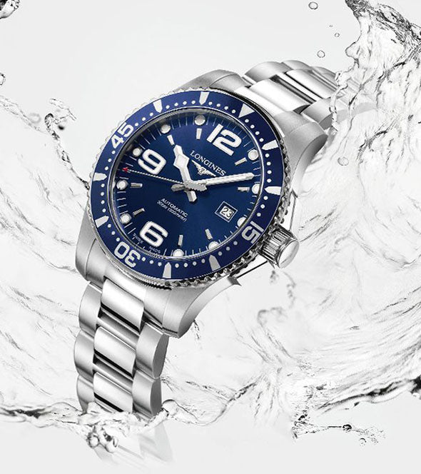 Gent's Longines HydroConquest Automatic Watch. The 41mm case and bracelet are stainless steel, the dial and bezel are blue and the glass is sapphire crystal. The watch features a date function. The watch is 300 metres water resistant and the movement is automatic.