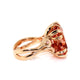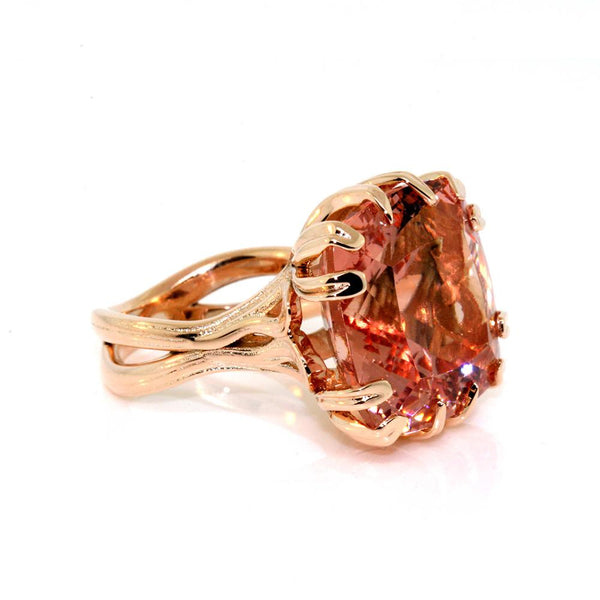 Custom-made 9k rose gold morganite dress ring. The cushion cut morganite is 23.2cts in weight, and measures 18mm with intense peach colour. The morganite is set into a floral inspired 9k rose gold setting.