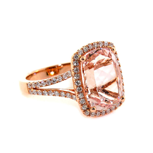 18k rose gold morganite and diamond halo ring. The ring is set with a 6ct cushion cut morganite and 0.60cts of round brilliant cut diamonds, GH colour and SI clarity.