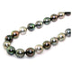 Strand of 33 x 10 - 12mm off round Tahitian cultured pearls with a rare greyish blue tone. The strand measures 41cm in length and comes with a sterling silver oval push button clasp The strand can be fitted with a 9k, 14k or 18k yellow or white gold clasp as required.