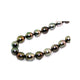 Strand of 35 x 9 to 11.6mm off round multi-coloured Tahitian cultured pearls. The strand measures 42cm in length and comes with a black rhodium plated sterling silver oval push button clasp. The strand can be fitted with a 9k, 14k or 18k yellow or white gold clasp as required.