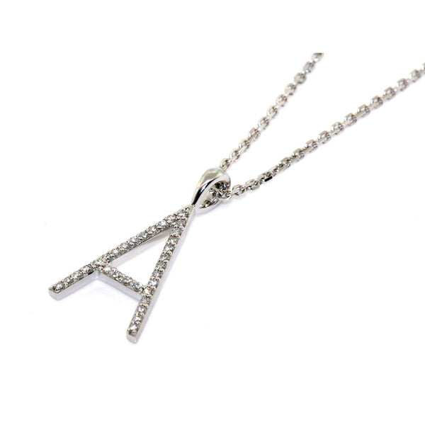 9k white gold initial "A" pendant, set with 0.10cts of round brilliant cut diamonds, quality GH / SI. The initials are made to order in the letter required.
