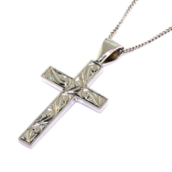 9k white gold cross pendant, hand-engraved with a scroll pattern and mille-grain edge by our engraver. The pendant has been hand-finished in our workshop. The pendant is finished with a 9k white gold curb link pendant chain 45cm in length.