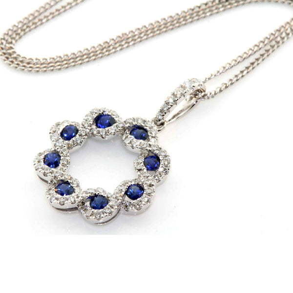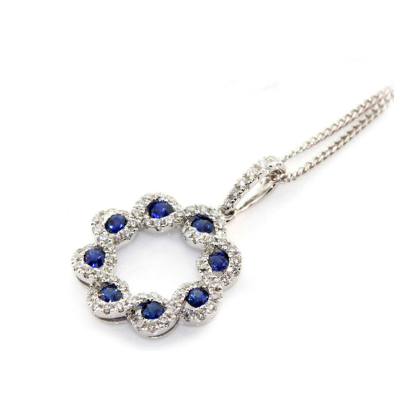 18k white gold sapphire and diamond pendant set with 0.33cts of round sapphires and 0.37cts of round brilliant cut diamonds. The pendant comes with a 9k white gold curb link pendant chain, 45cm in length. Currently out of stock but available to order.