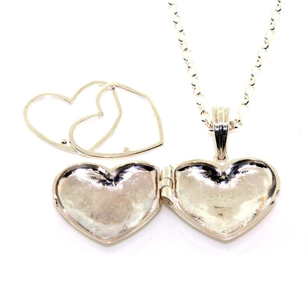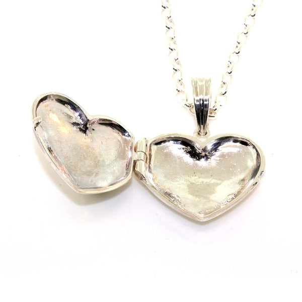 Hand-Assembled Sterling Silver Heart Locket with Enhancer Bale. This is a beautifully made traditional opening locket, manufactured in our workshop. The locket can be engraved or set with gemstones. The locket comes with a sterling silver belcher link chain, measuring 45cm in length.