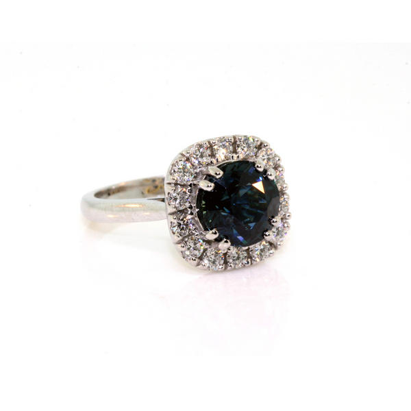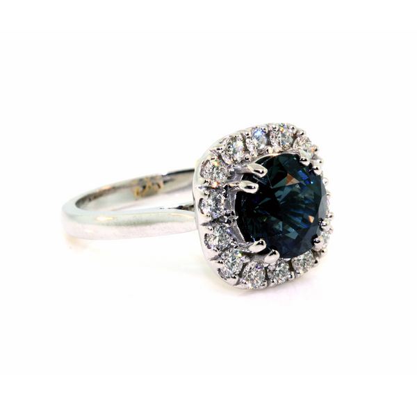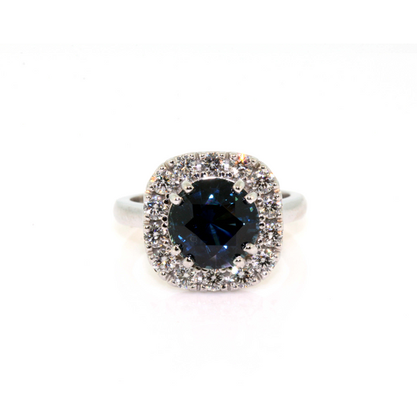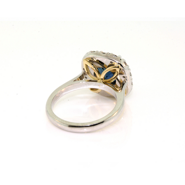 Custom-made platinum and 18k yellow gold halo ring set with a 4.18ct Madagascan sapphire measuring 9.40 x 9.40 x 6.17mm, AIGS Certified, and 0.82cts of round brilliant cut diamonds, F-G colour and VS-SI1 clarity. Currently out of stock.