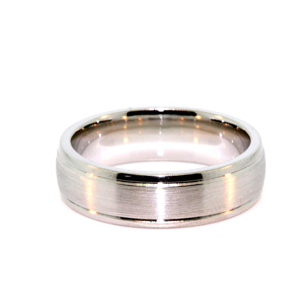 Gent's platinum wedding ring. The ring is 6mm wide and has a brushed finished centre. The ring is finished with an inner comfort curve. The ring is ordered in the required finger size.