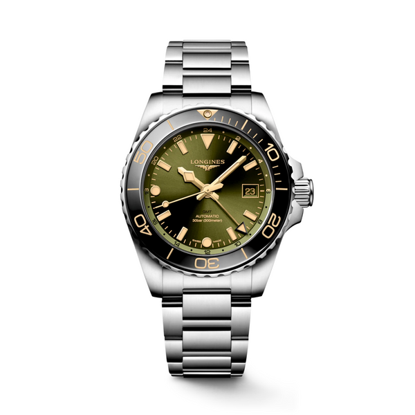 Gent's Longines HydroConquest GMT Automatic Watch. The 41mm case and bracelet are stainless steel with a black ceramic bezel. The dial is green and the glass is sapphire crystal. The watch features a 24 hours hand with a time zone mechanism for a second time zone. The watch has a date function and is 300m metres water resistant. The movement is automatic.