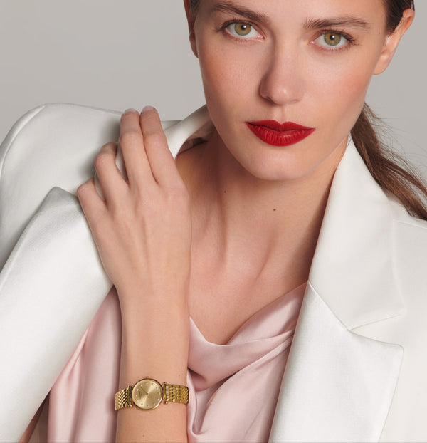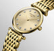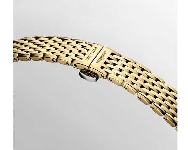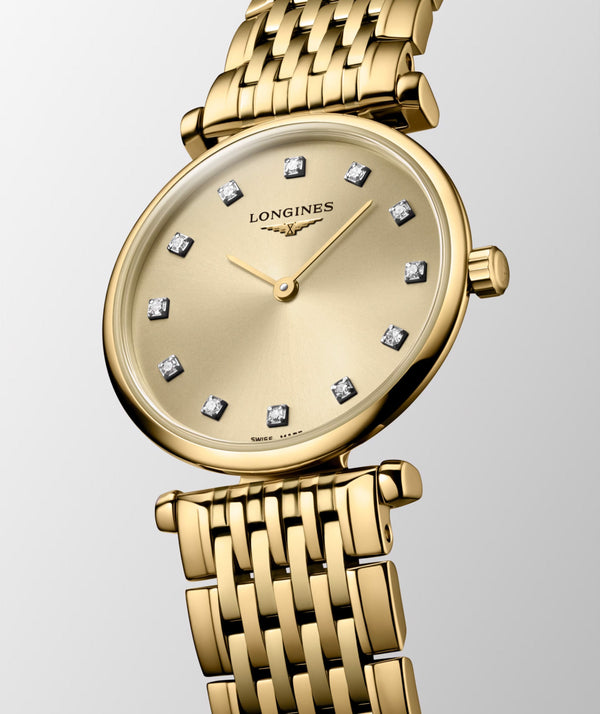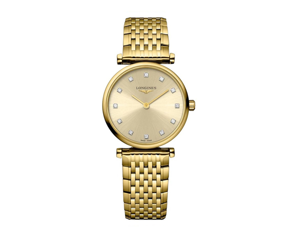 Ladies' Longines La Grande Classique Diamond Set Watch. The 24mm case and bracelet are yellow gold PVD on stainless steel. The dial is gold coloured with 12 diamond set hour markers and the glass is sapphire crystal. The movement is quartz.