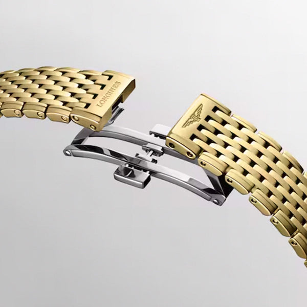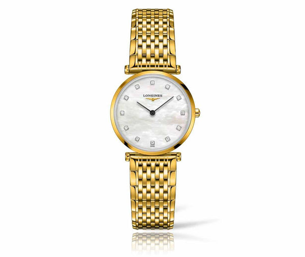 Ladies Longines La Grande Classique Watch. The 29mm case and bracelet are yellow gold PVD on stainless steel, the dial is white mother-of-pearl with 12 diamonds set hour markers and the glass is sapphire crystal. The movement is quartz.
