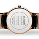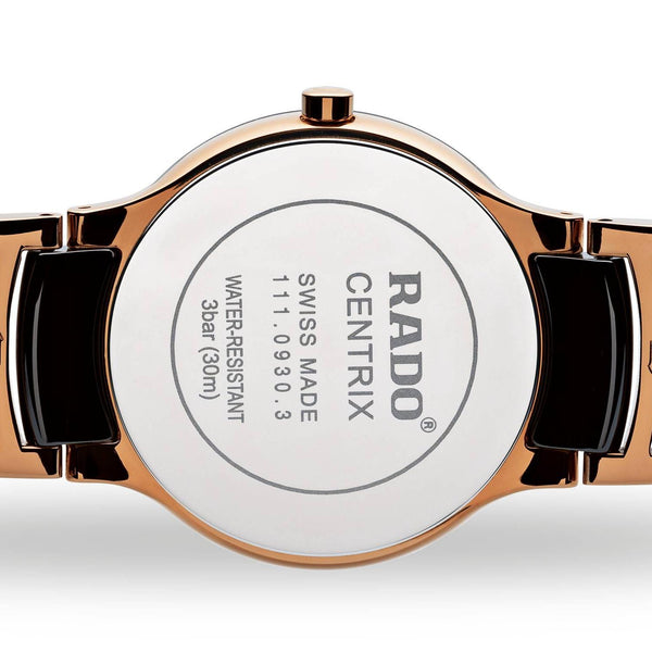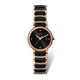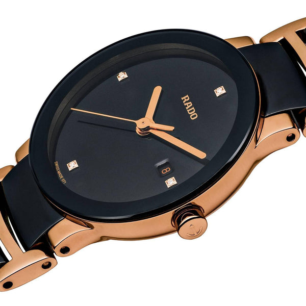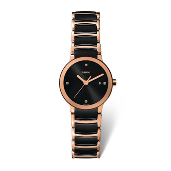 Ladies' Rado Centrix Quartz Watch. The case and strap are rose gold PVD on stainless steel and black high tech ceramic. The dial is black and set with four diamonds. The glass is sapphire crystal and the movement is quartz. Currently out of stock.