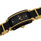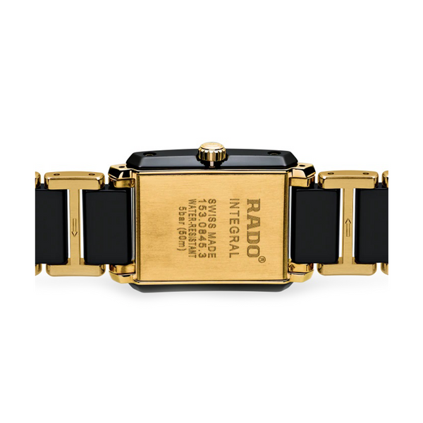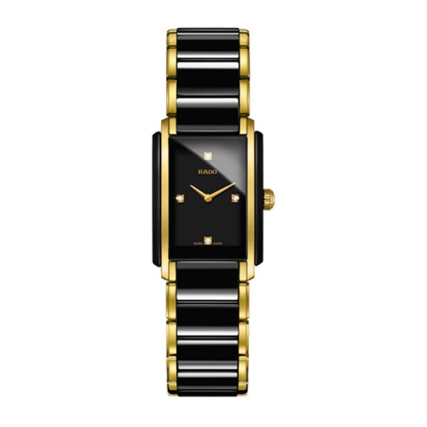 Ladies Rado Integral Quartz Watch. The case and bracelet are bicolour - 18k yellow gold PVD on stainless steel and black high tech ceramic. The dial is black and set with four diamonds. The glass is sapphire crystal and the movement is quartz.