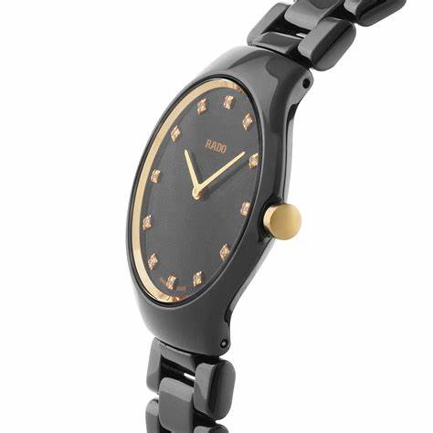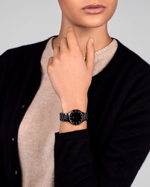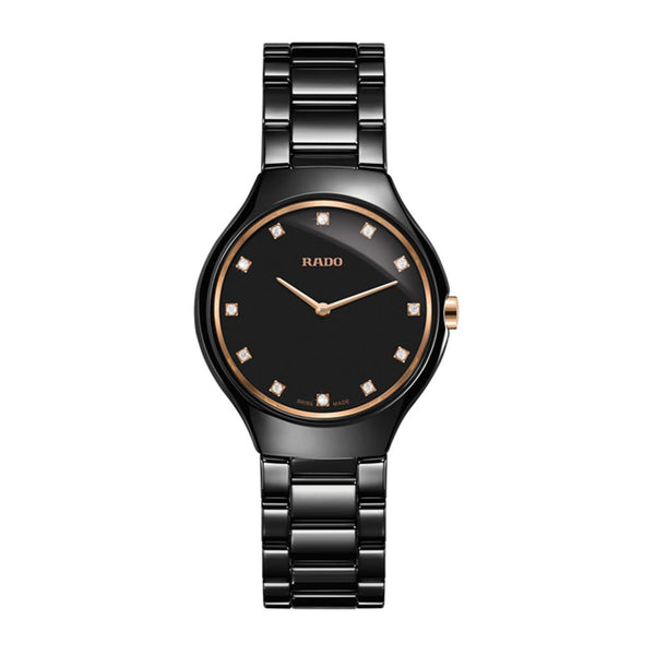 Ladies Rado True Thinline Diamond Set Quartz Watch. The 30mm case and bracelet are black high tech ceramic with a rose coloured bezel and crown. The dial is black and the glass is sapphire crystal. The hour markers are diamond set and the movement is quartz. Currently out of stock but available to pre-order.