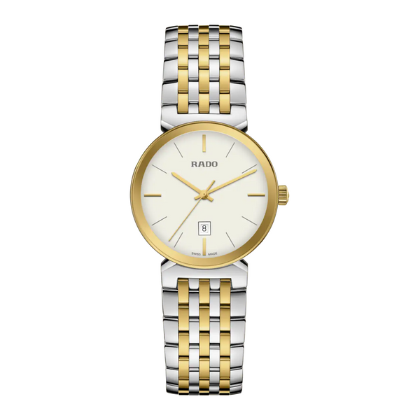 Ladies Rado Florence Classic Quartz Watch. The 30mm case and bracelet are bicolour: yellow gold PVD on stainless steel. The dial is white with yellow batons and a date display. The glass is sapphire crystal. The movement is quartz.
