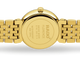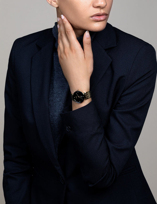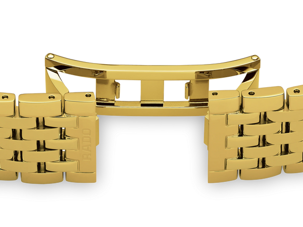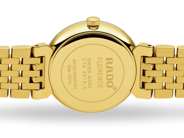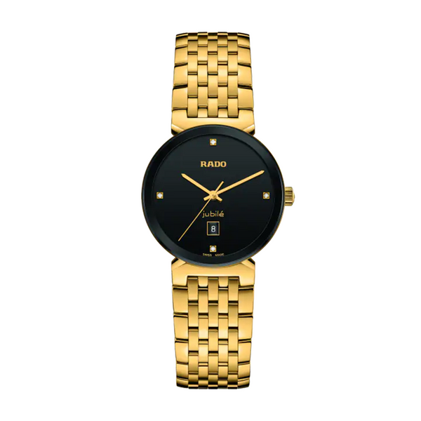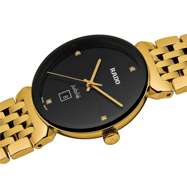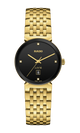 Ladies Rado Florence Classic Quartz Watch. The 30mm case and bracelet are yellow gold PVD on stainless steel. The dial is black with four diamond hour markers and a date display. The glass is sapphire crystal. The movement is quartz.
