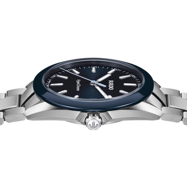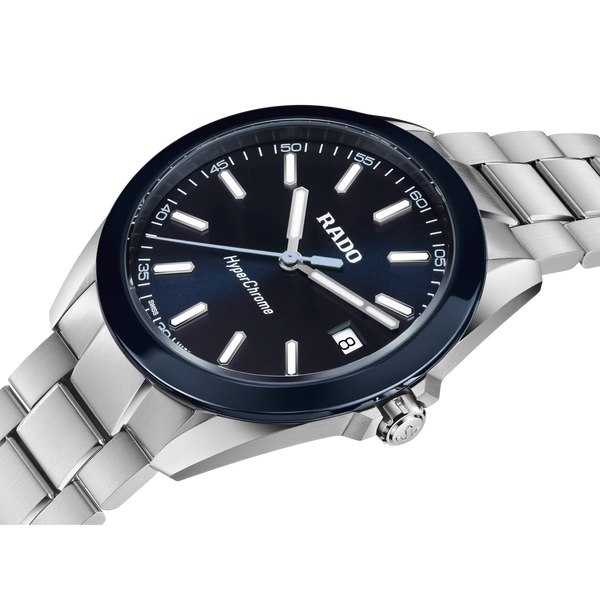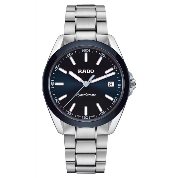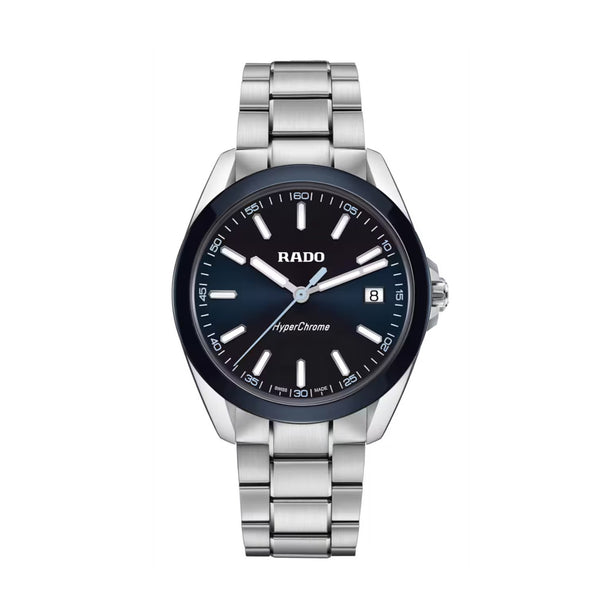 Gent's Rado HyperChrome Quartz Watch. The 41.5mm case and bracelet are stainless steel. The bezel is blue high-tech ceramic. The dial is dark blue with a date function. The glass is sapphire crystal. The watch is 150 metres water resistant. The movement is quartz.