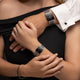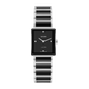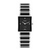 Ladies Rado Integral Quartz Watch. The 23mm case and bracelet are bicolour: stainless steel with black high-tech ceramic central links. The dial is black with four diamond set hour markers, and the glass is sapphire crystal. The movement is quartz.