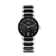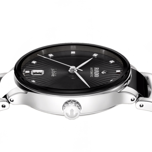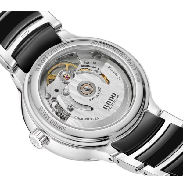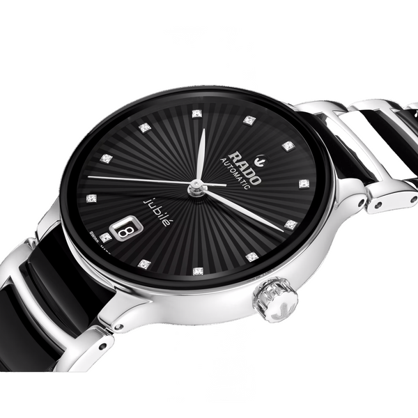 Ladies Rado Centrix Automatic Watch. The 35mm case is stainless steel. The bracelet is bicolour: stainless steel with black high tech ceramic centre links. The facetted dial is black with 12 diamond set hour markers and a date function. The glass is sapphire crystal and the case back is transparent with a sapphire crystal glass. The movement is automatic.