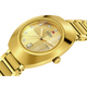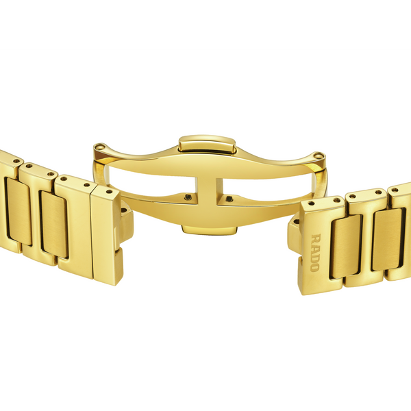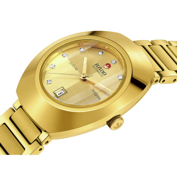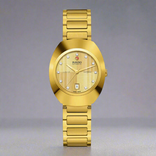 Ladies RADO Diastar Original Automatic Watch. The 30mm case and bracelet are yellow gold PVD on stainless steel and the bezel is gold coloured ceramos. The dial is gold coloured with eleven diamond set hour markers and a date function. The glass is sapphire crystal and the watch is 100m water resistant. The movement is automatic.
