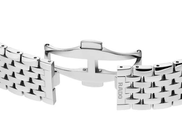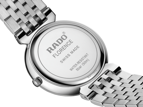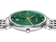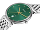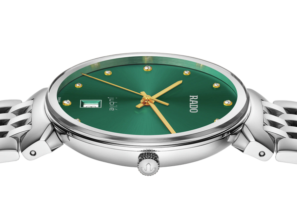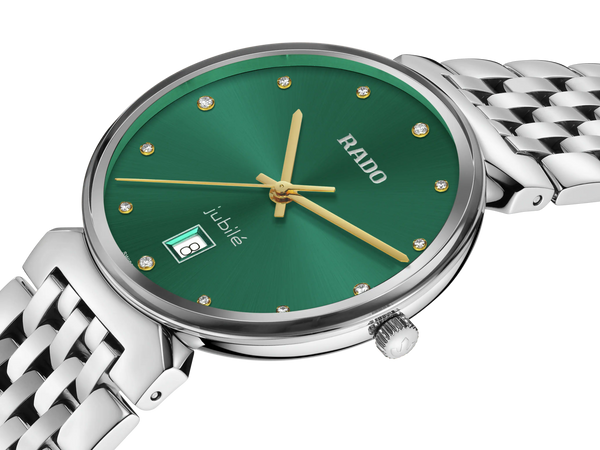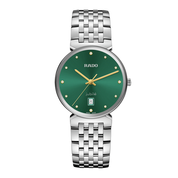 Rado Florence Quartz Watch. The 38mm case and bracelet are stainless steel. The dial is green with twelve diamond hour markers and a date function. The glass is sapphire crystal. The movement is quartz.