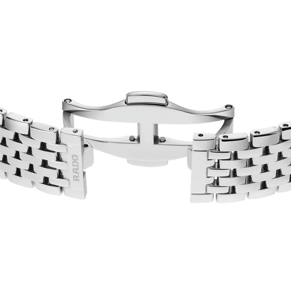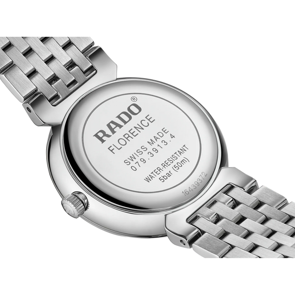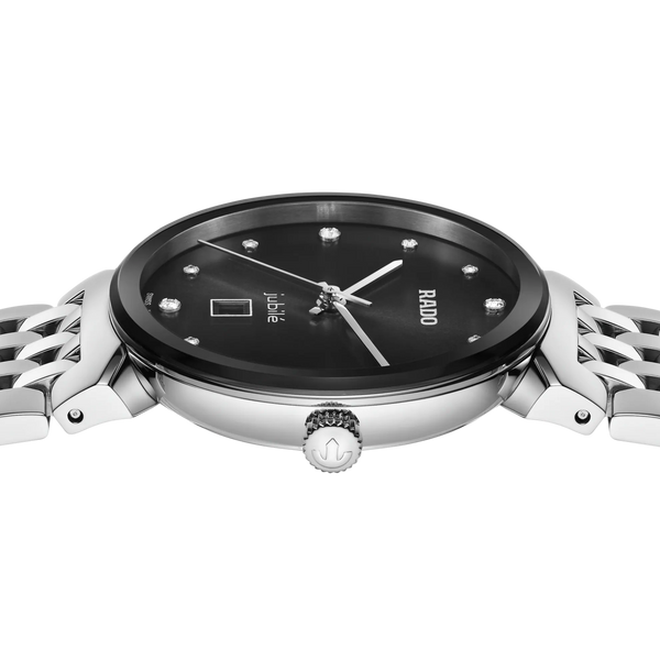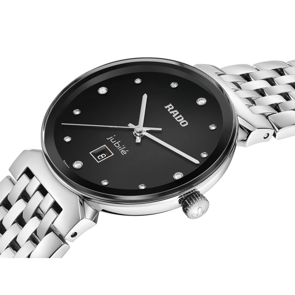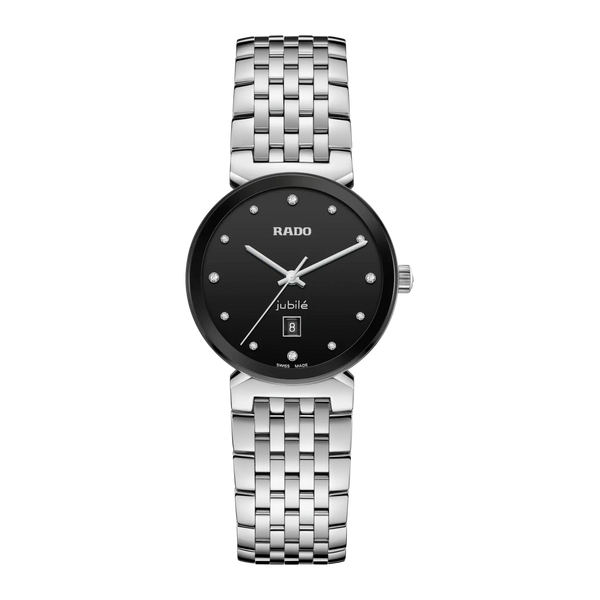 Ladies Rado Florence Classic Quartz Watch. The 30mm case and bracelet are stainless steel. The dial is black with twelve diamond hour markers and a date function. The glass is sapphire crystal. The movement is quartz. Currently out of stock but available to order.