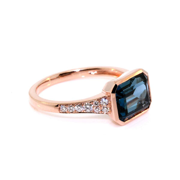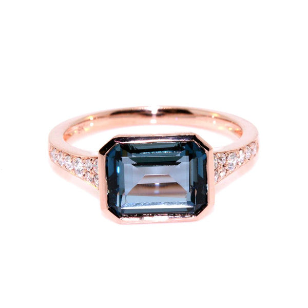 9k rose gold ring set with a 2.75ct emerald cut London blue topaz and 0.21cts of round brilliant cut diamonds, GH colour and SI clarity.
