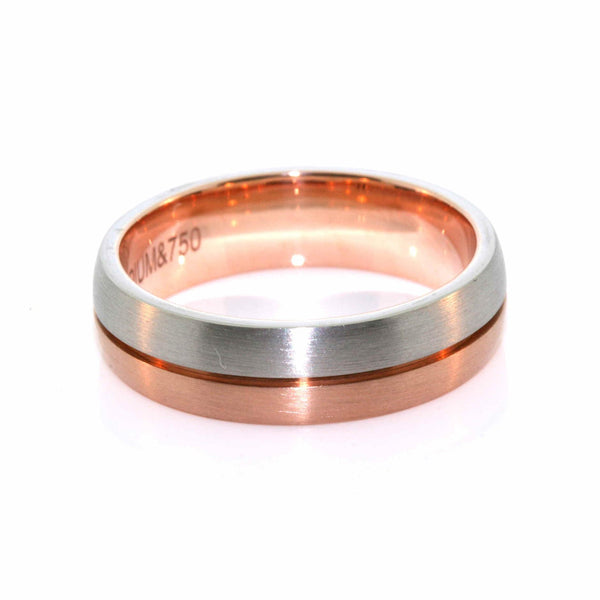 Gent's 18k rose and white gold wedding ring. The ring is 6mm wide and is from the Dora Collection. The ring is ordered in the required finger size.