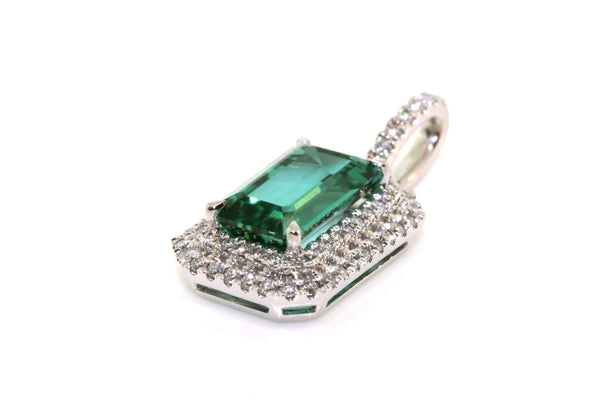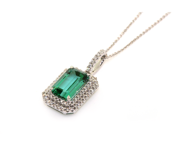 18k white gold pendant set with a stunning 2.27ct Brazilian green tourmaline measuring 10 x 6.2mm. Set into the double halo and bail are 0.33cts of round brilliant cut diamonds, FG colour and VS-SI1 clarity.