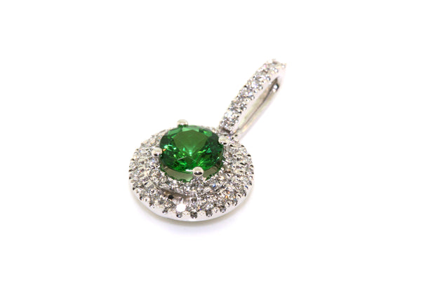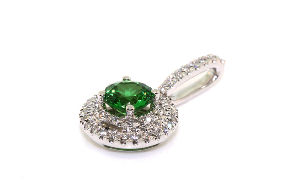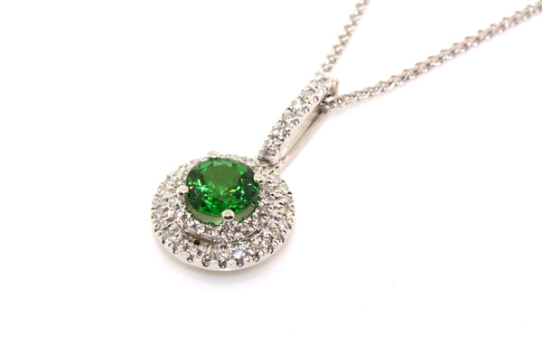 18k white gold halo pendant set with a 0.65ct Tsavorite garnet and 0.26cts of round brilliant cut diamonds, F-G colour and VS-SI clarity. The pendant comes with a 9k white gold Italian 1mm diamond cut foxtail chain, 45cm in length.