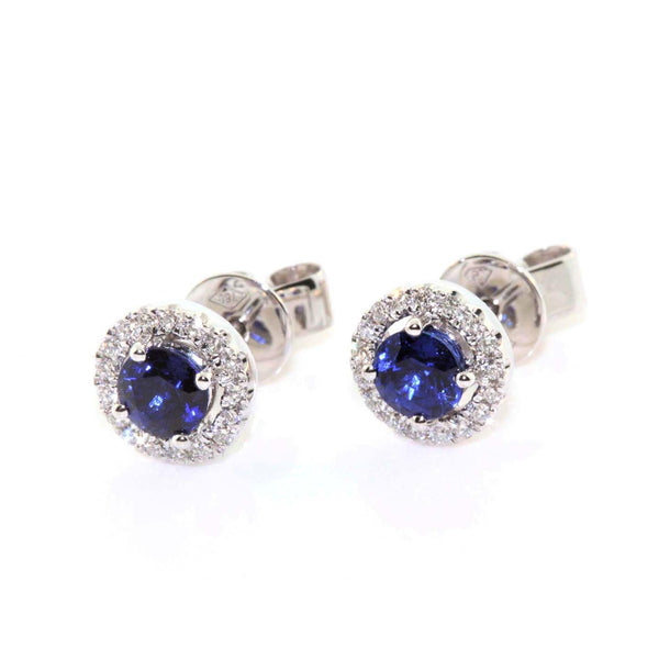 Platinum Halo Stud Earrings set with Ceylonese sapphires and diamonds. The earrings are set with 0.80cts of intense blue round Ceylonese sapphires and 0.18cts of round brilliant cut diamonds, GH colour, SI clarity. Currently out of stock.