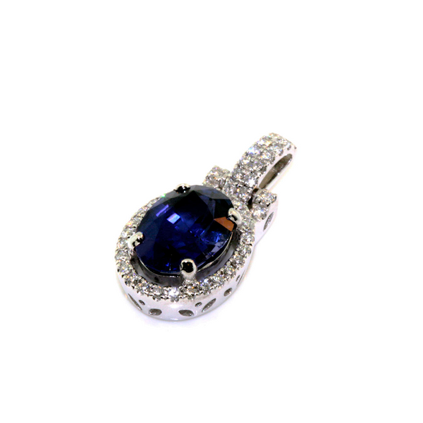 Custom-made 18k white gold sapphire and diamond halo pendant, set with a 6.87ct oval Sri Lankan (Ceylonese) sapphire, mid-blue in colour with GRS certificate. The pendant is also set with 0.56cts of round brilliant cut diamonds, quality FG / VS-SI1. This stunning pendant has recently been sold. David Keefe has started the journey to find a beautiful sapphire which will be set into a new design created by our master craftsmen.