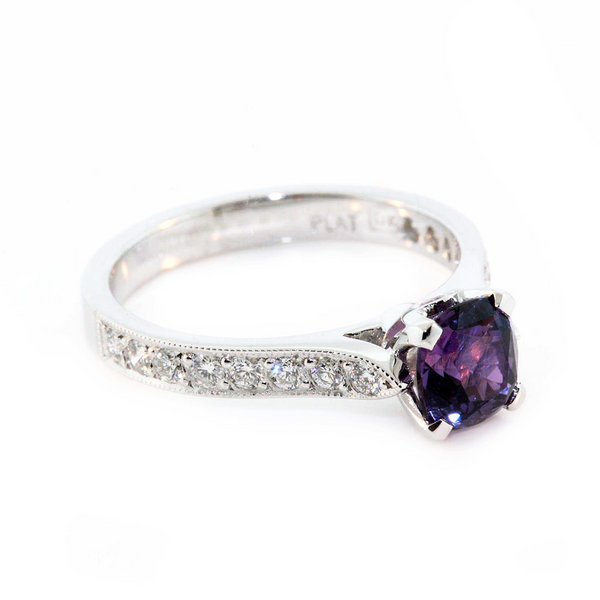 Platinum ring set with a 1ct cushion cut purple Ceylonese sapphire centre stone and 0.36cts of round brilliant cut diamonds, FG colour, VS-SI clarity. This design is made to order in the required finger size.