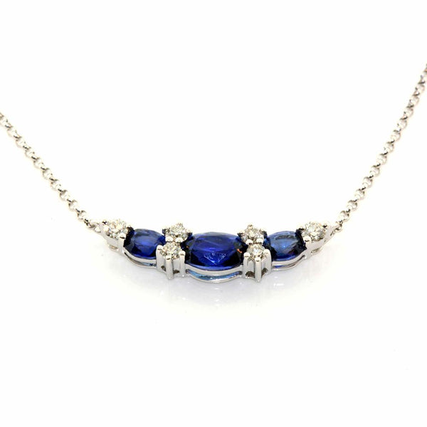 18k White Gold Sapphire and Diamond Pendant. The pendant is set with 0.89cts of oval blue Ceylonese sapphires and 0.20cts of round brilliant cut diamonds, G-H colour and VS-SI clarity. The pendant comes with an attached 18k white gold 42cm cable link pendant chain.