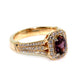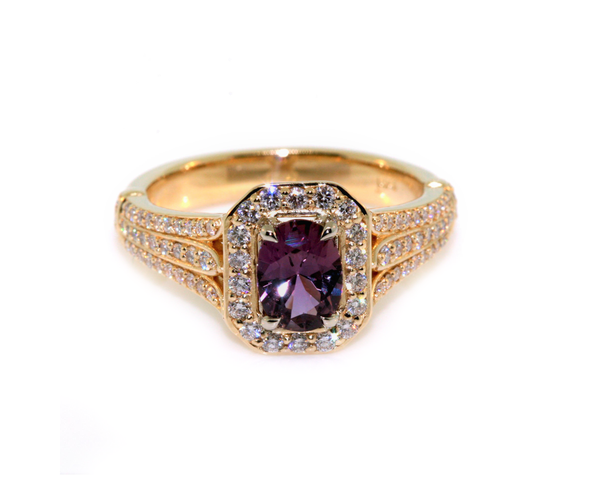 14k Yellow Gold Sapphire and Diamond Ring. The ring is set with a stunning 0.97ct oval Ceylonese (Sri Lankan) sapphire, pinkish purple in colour and measuring 7.2 x 5.2mm. Set into the halo and the shoulders of the rings are 0.50cts of round brilliant cut diamonds, FG colour and VS-SI clarity.