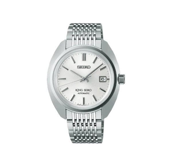 Gents King Seiko Automatic Watch. The 39.4mm case and bracelet are stainless steel with silver coloured dial. The case shape is based on the King Seiko 45KCM from 1969, whose characteristically curved silhouette inspired the design of other King Seiko creations that followed. The new King Seiko series adopts the contours of the 1969 watch but reimagines them for modern times. The movement is a calibre 6L35 automatic.
