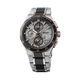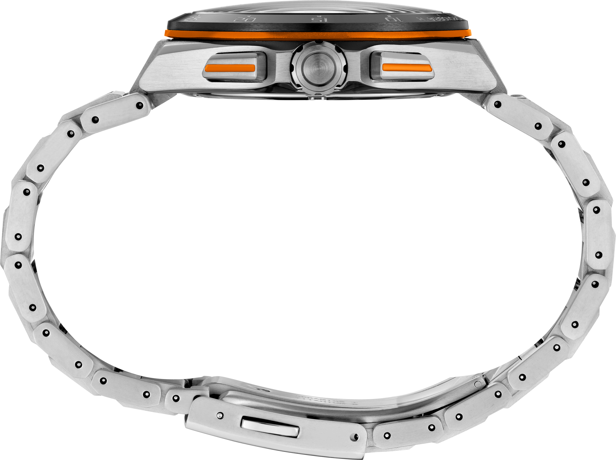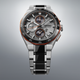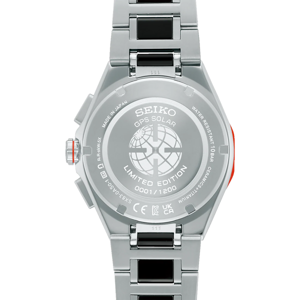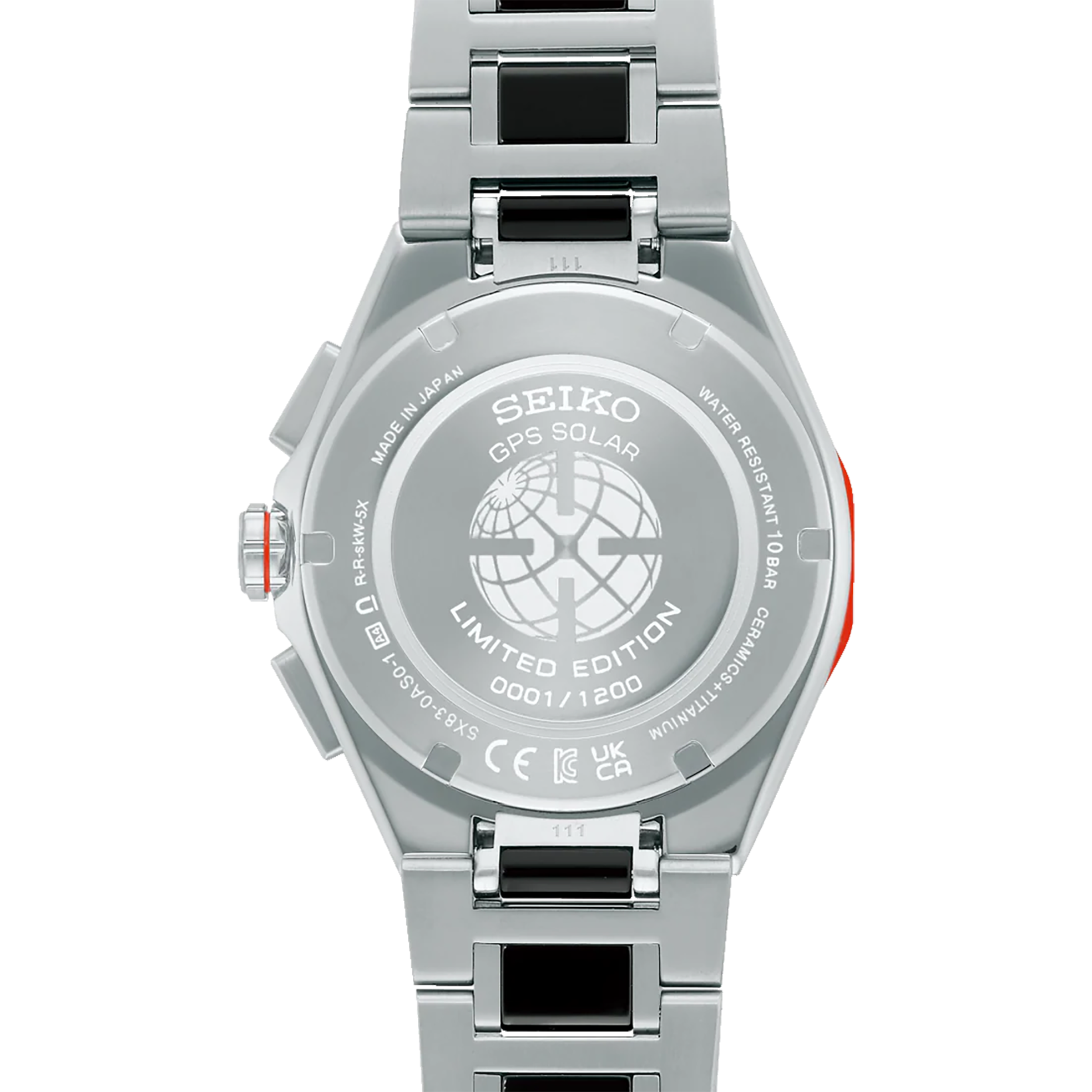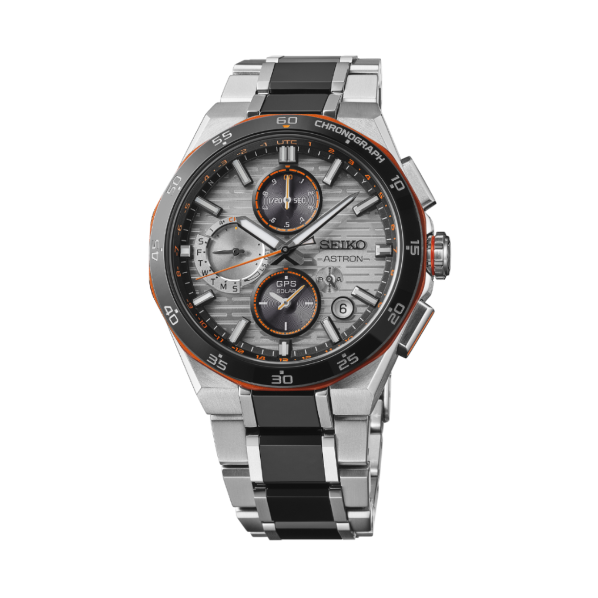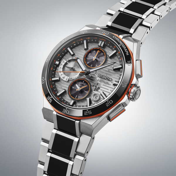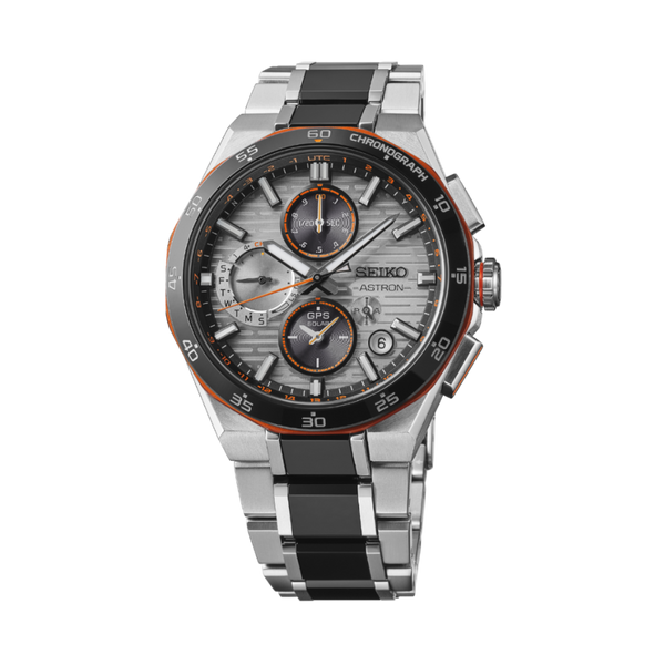 Seiko Astron GPS Solar Dual-Time Chronograph 2025 Limited Edition Watch. The 43.4mm case is titanium, and the bracelet is titanium with black ceramic middle links. The bezel is black ceramic and titanium. The case, bezel and dial feature orange accents. The silver dial has a horizontal line pattern with three sub-dials, and the glass is sapphire crystal. The watch features a GPS World Time function (38 cities), Second Time Zone sub-dial, Chronograph, Perpetual Calendar, Date/ Day of the Week display, Power Reserve Indicator, Satellite Acquisition Status display function, GPS Signal Reception function and Daylight-Saving Time Auto Adjust. The watch is 100m water resistant and the movement is solar powered. One of 1,200 pieces worldwide.