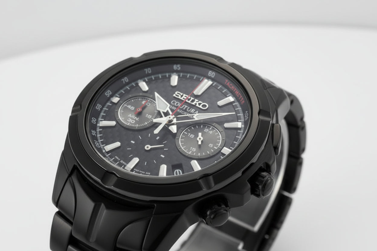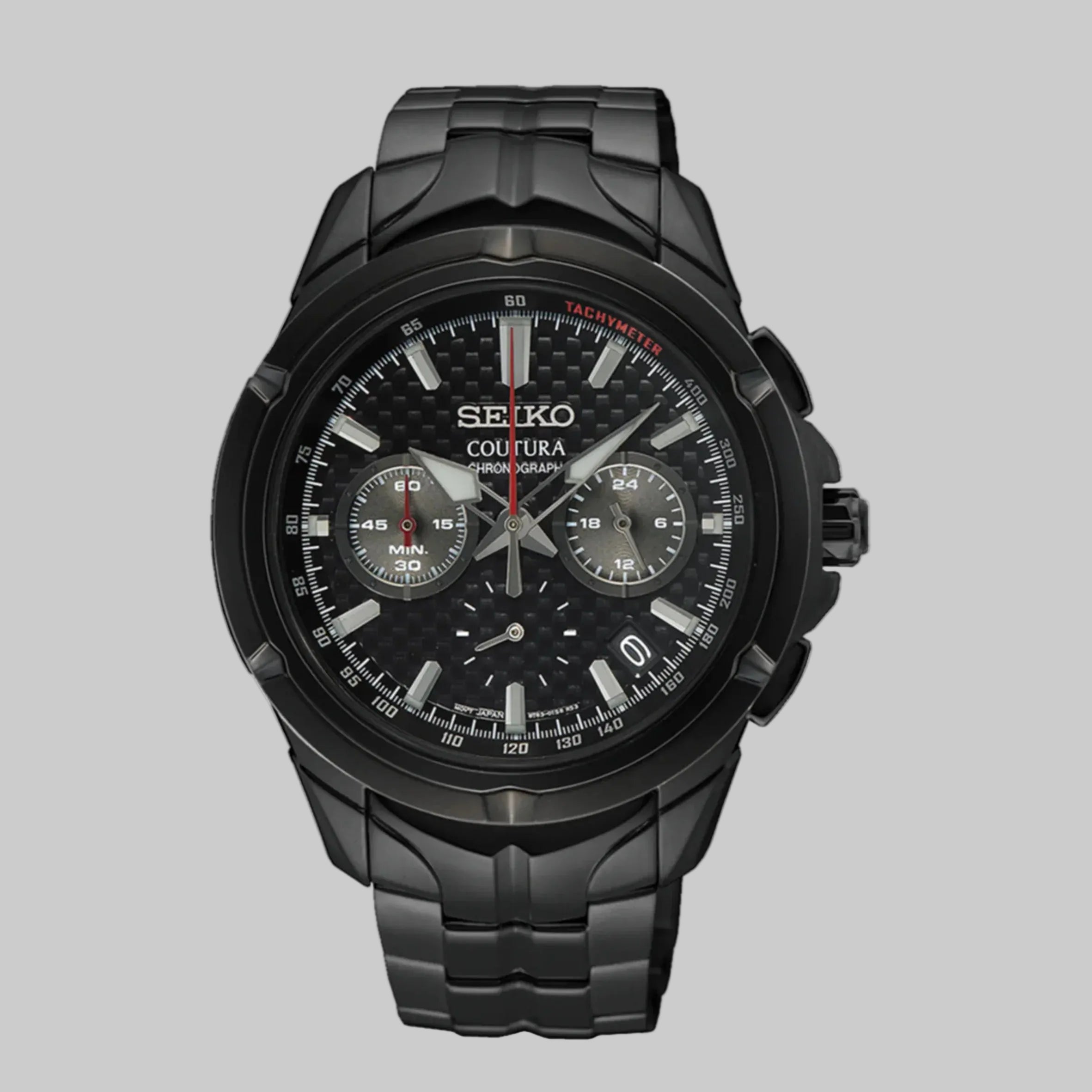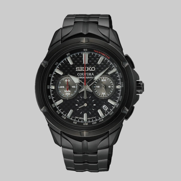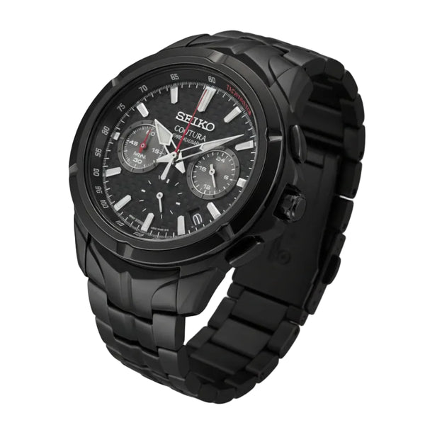 Gents Seiko Coutura Chronograph Black PVD on Stainless Steel 42mm Case and Bracelet Black Patterned Dial with Silver Coloured Accents Three Sub-Dials Tachymetre Inner Ring Sapphire Crystal Glass Date 100m Water Resistant Quartz Watch.